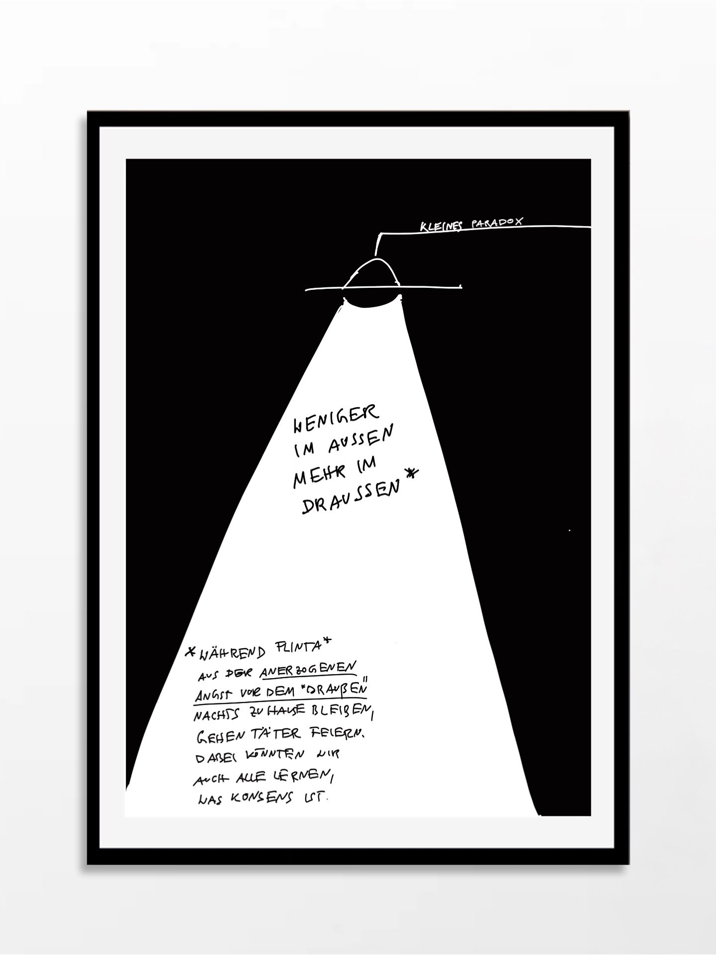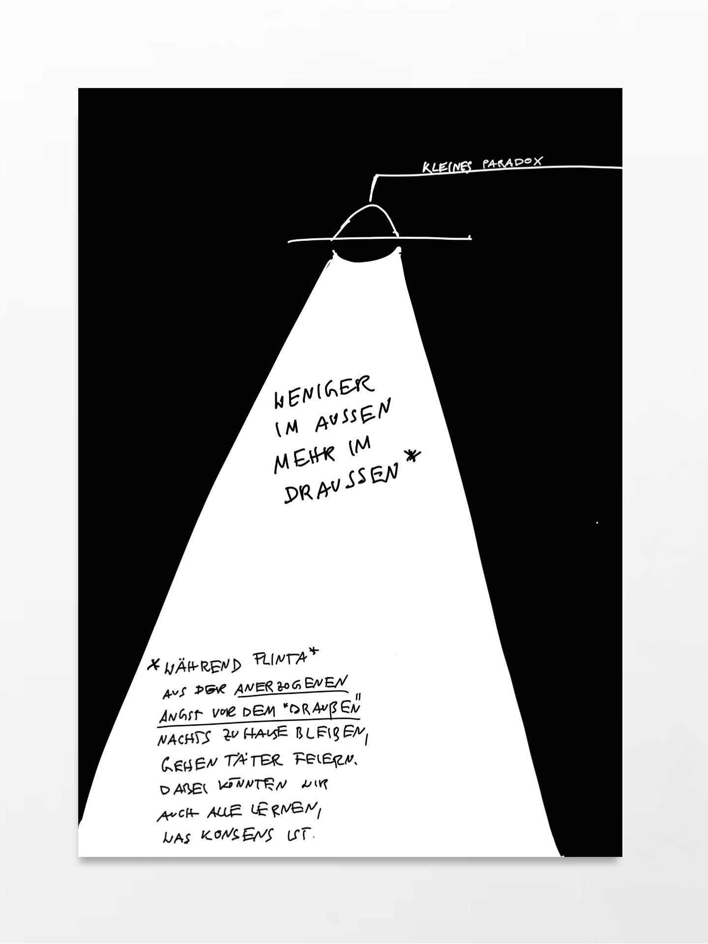 Während FLINTA* aus der anerzogenen Angst vor dem „Draußen“ nachts eher zu Hause bleiben oder wenn, mit einem beachtlichen Repertoire an Wissen wo lang und wo lang nicht, gehen Täter ungestört feiern. Dabei könnten wir auch alle lernen was Konsens ist. Naja.